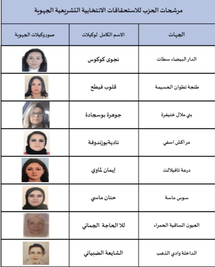 وقدم الحزب نادية بزندوفة، وكيلة اللائحة الجهوية بجهة مراكش آسفي، وإيمان لماوي بجهة درعة تافيلالت، وحنان ماسي بجهة سوس ماسة، وللاالحاجة الجماني بجهة العيون الساقية الحمراء.