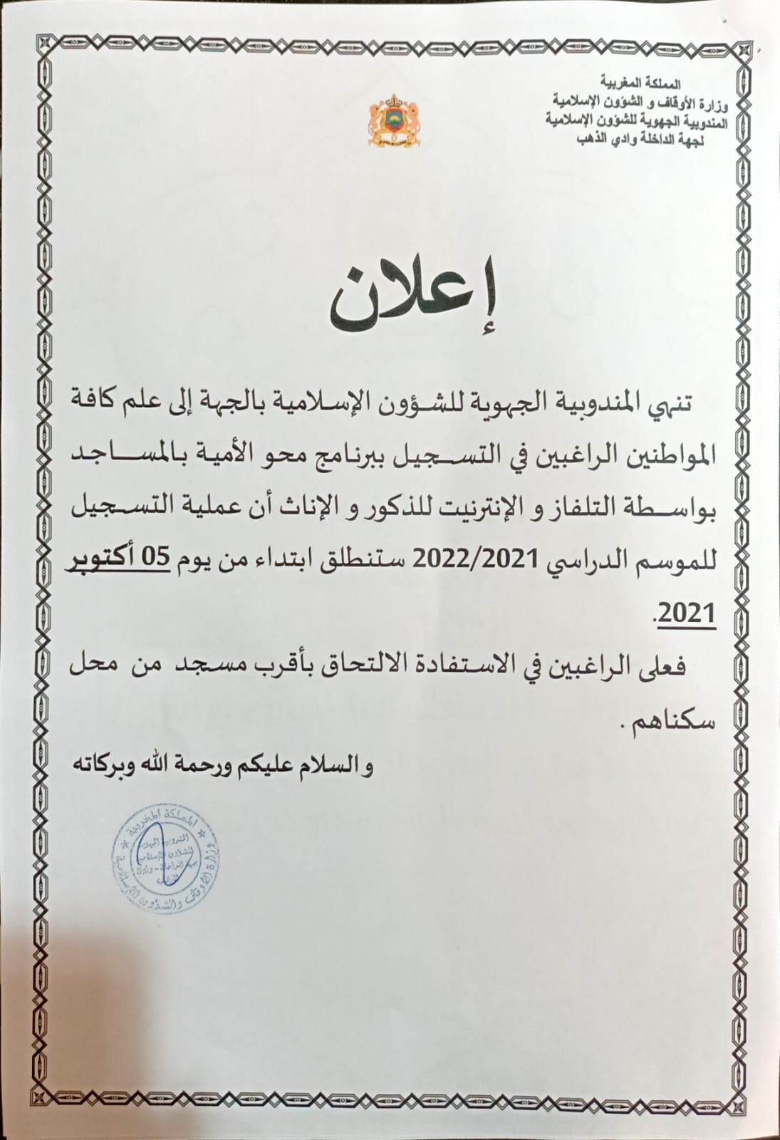تنهي المندوبية الجهوية للشؤون الإسلامية بالجهة إلى علم كافة المواطنين الراغبين في التسجيل ببرنامج محو الأمية بالمسـاجـد بواسـطة التلفاز و الإنترنيت للذكور و الإناث أن عملية التسجيل للموسم الدراسي 2022/2021 ستنطلقابتداء من يوم 05 أكتوبر الجاري.