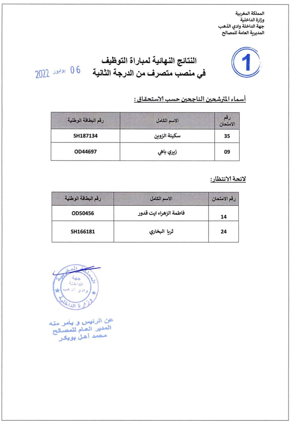 النتائج النهائية لمباراة التوظيف في منصب متصرف من الدرجة الثانية