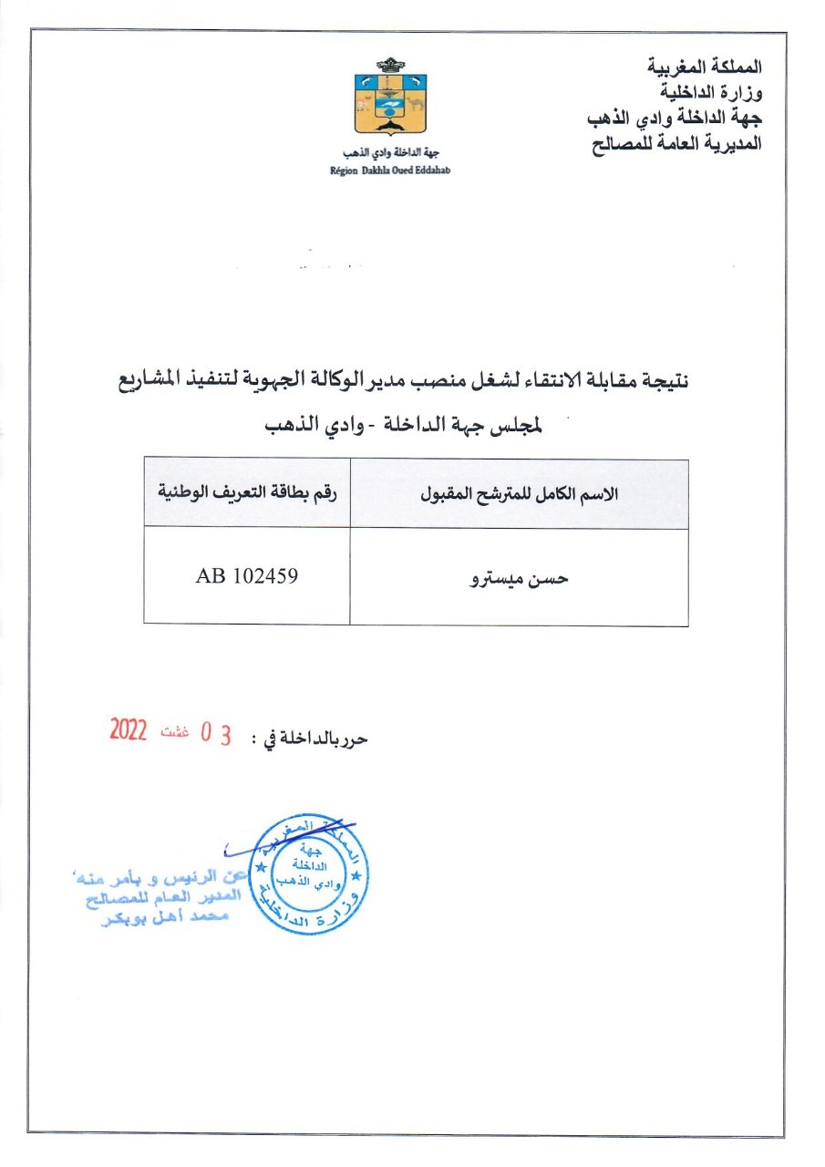 نتائج مقابلة الانتقاء لشغل منصب مدير الوكالة الجهوية لتنفيذ المشاريع (AREP) لمجلس جهة الداخلة – وادي الذهب.