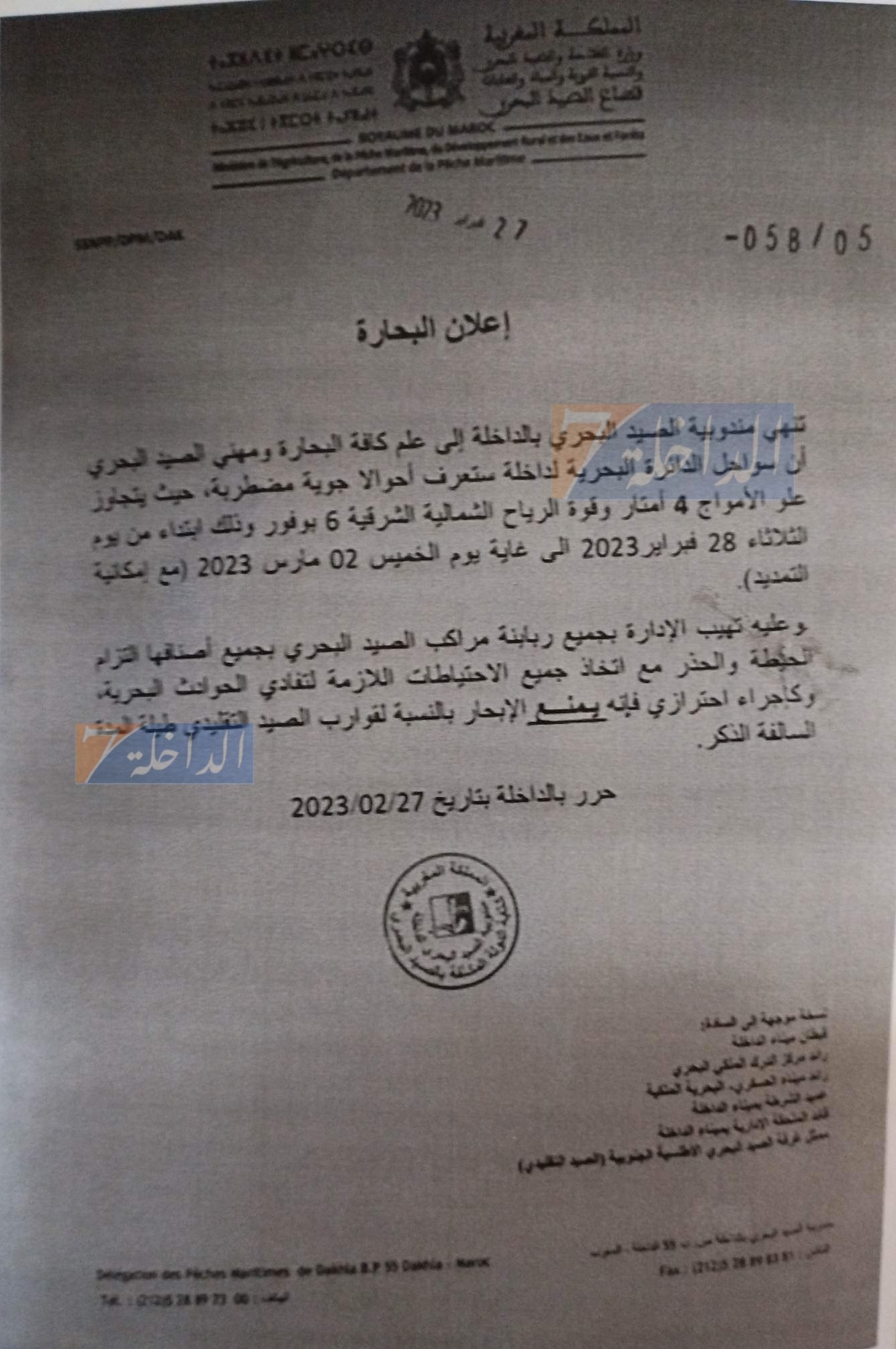 نبهت مندوبية الصيد البحري بالداخلة كافة البحارة ومهني الصيد البحري الى ان سواحل الدائرة البحرية لداخلة ستعرف أحوالا جوية مضطربة.