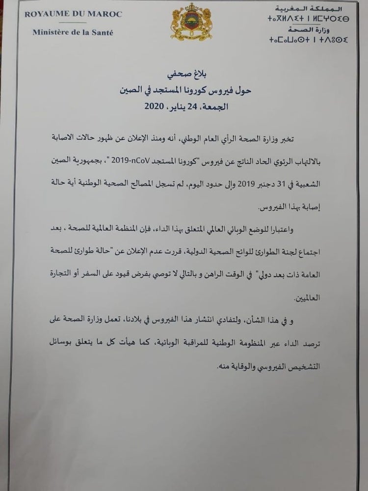 اصدرت وزارة الصحة بلاغا تخبر من خلاله الراي العام الوطني انه ومنذ الإعلان عن ظهور حالات الإصابة بالالتهاب الرئوي الحاد الناتج عن فيروس “كورونا بجمهورية الصين الشعبية، لم تسجل المصالح الصحية الوطنية أية حالة إصابة بهذا الفيروس”.