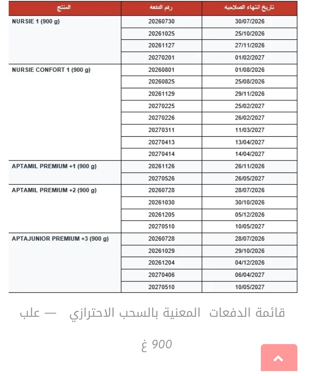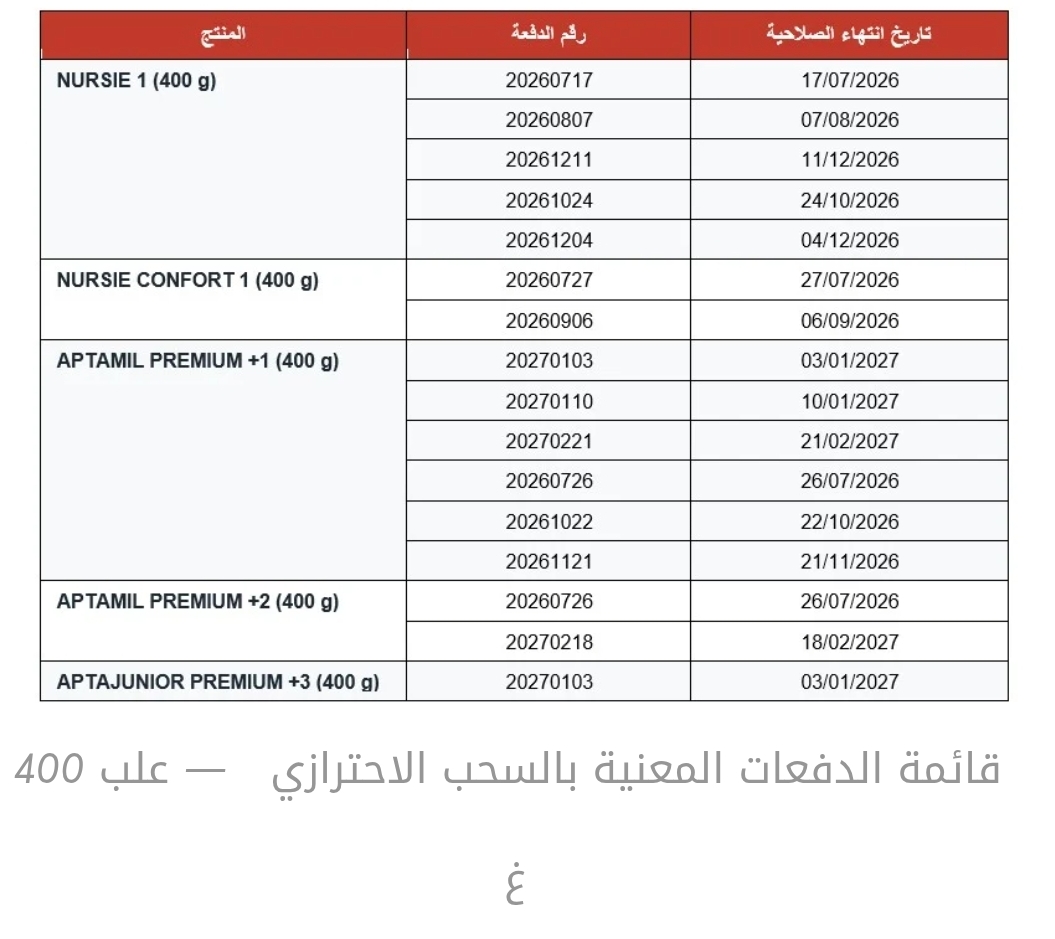 وأوصى المكتب الوطني للسلامة الصحية للمنتجات الغذائية بتجنب استعمال حليب الرضع المنتمي إلى الدفعات المشار إليها في الجدولين، وذلك كإجراء احترازي.