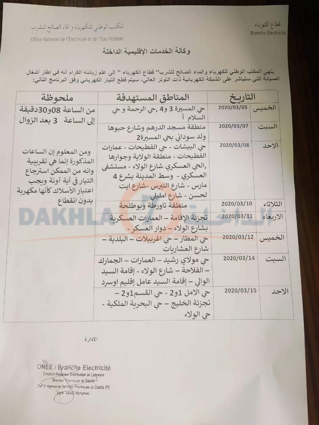 أصدر المكتب الوطني للكهرباء والماء الصالح للشرب -قطاع الكهرباء- بمدينة الداخلة، بلاغ موجه إلى ساكنة المدينة، حول انقطاع التيار الكهربائي عن عدة أحياء بالداخلة.