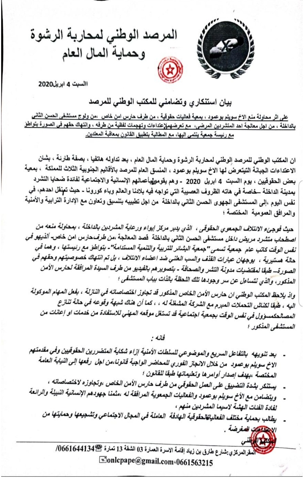 بلاغ…المرصد الوطني لمحاربة الرشوة يستنكر الاعتداء على منسقه سويلم بوعمود بجهة الداخلة وادي الذهب