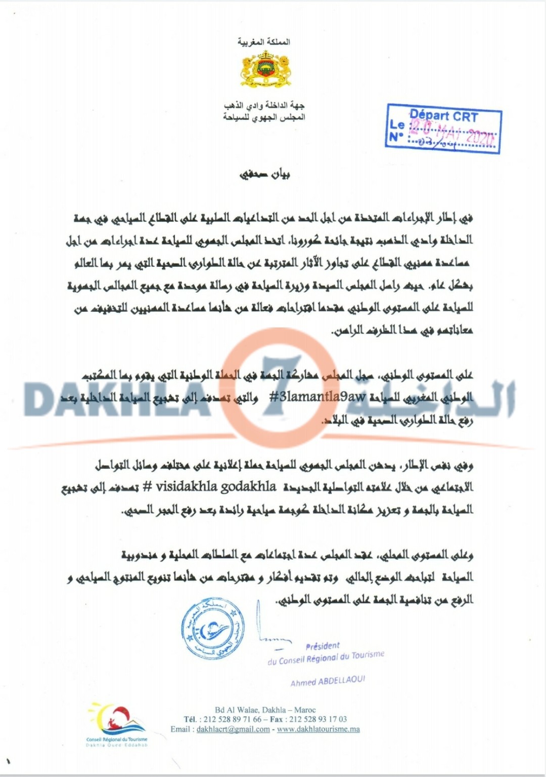 بيان!! “CRT” الداخلة يراسل الوزارة من أجل تخفيف من تداعيات كورونا على مهنيي قطاع السياحة