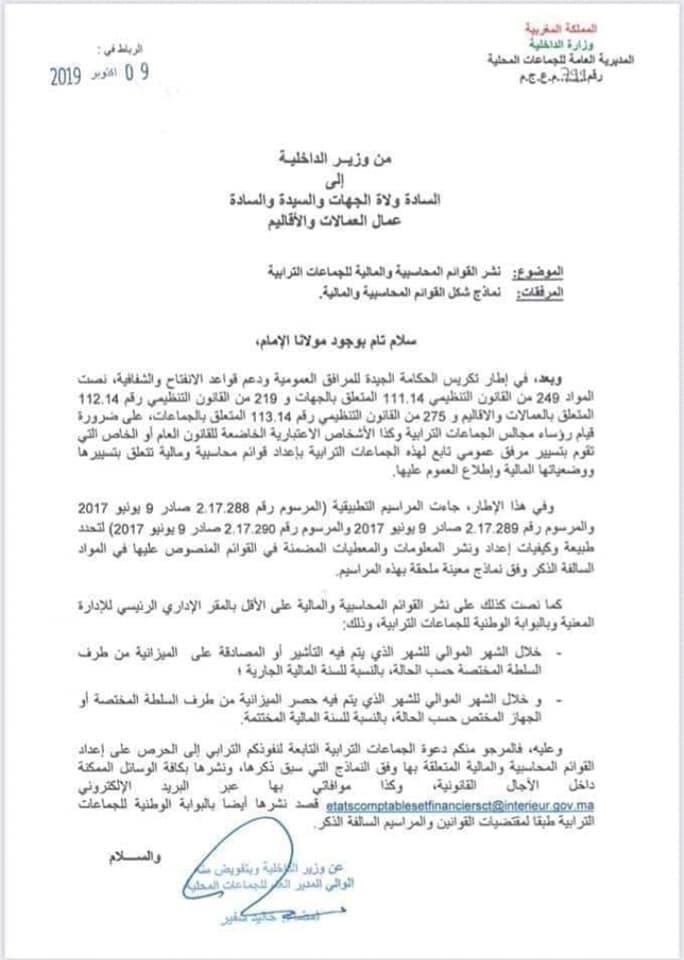 وجه وزير الداخلية عبد الوافي لفتيت ، دوريةً إلى ولاة الجهات و عمال العمالات و الأقاليم ، يطلب منهم العمل دعوة رؤساء الجماعات التابعة لنفوذهم إلى نشر القوائم المحاسبية و المالية للجماعات الترابية للعموم.