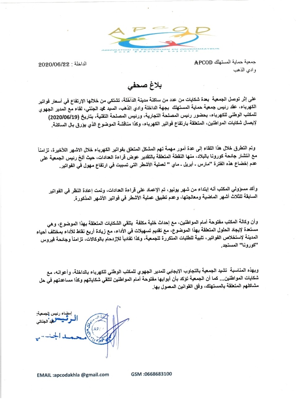 وثيقة..بعد ارتفاع فواتير الكهرباء والماء الصالح للشرب..حماية المستهلك بجهة الداخلة وادي الذهب تدخل على خط