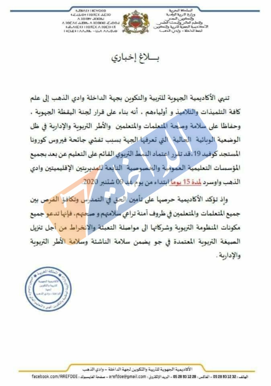 رسميا ..اعتماد التعليم عن بعد في جميع المؤسسات التعليمية العمومية والخصوصية بجهة الداخلة وادي الذهب