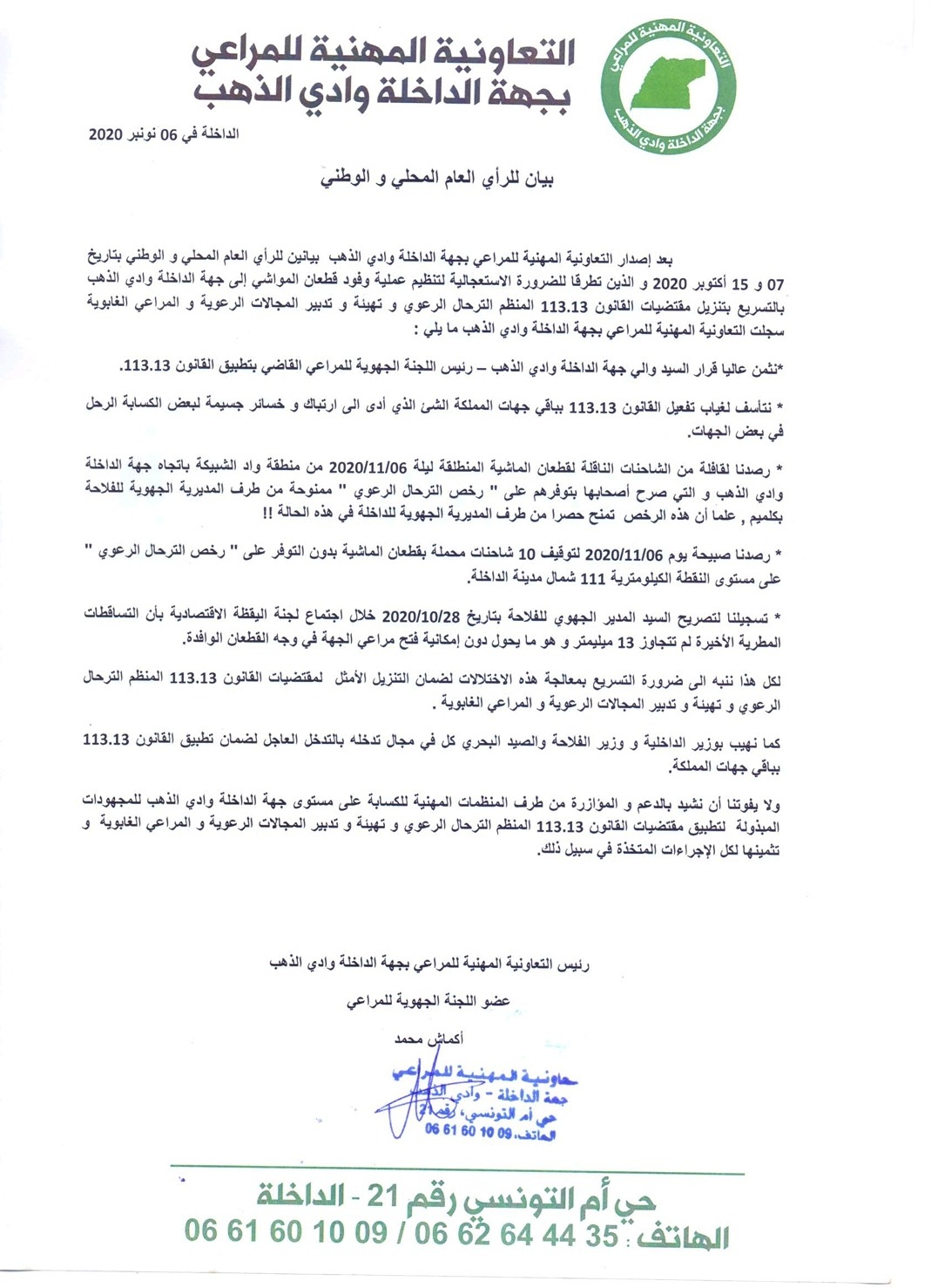 التعاونية المهنية للمراعي بجهة الداخلة وادي الذهب تطالب بضرورة تفعيل قانون 113.13 بجميع الجهات