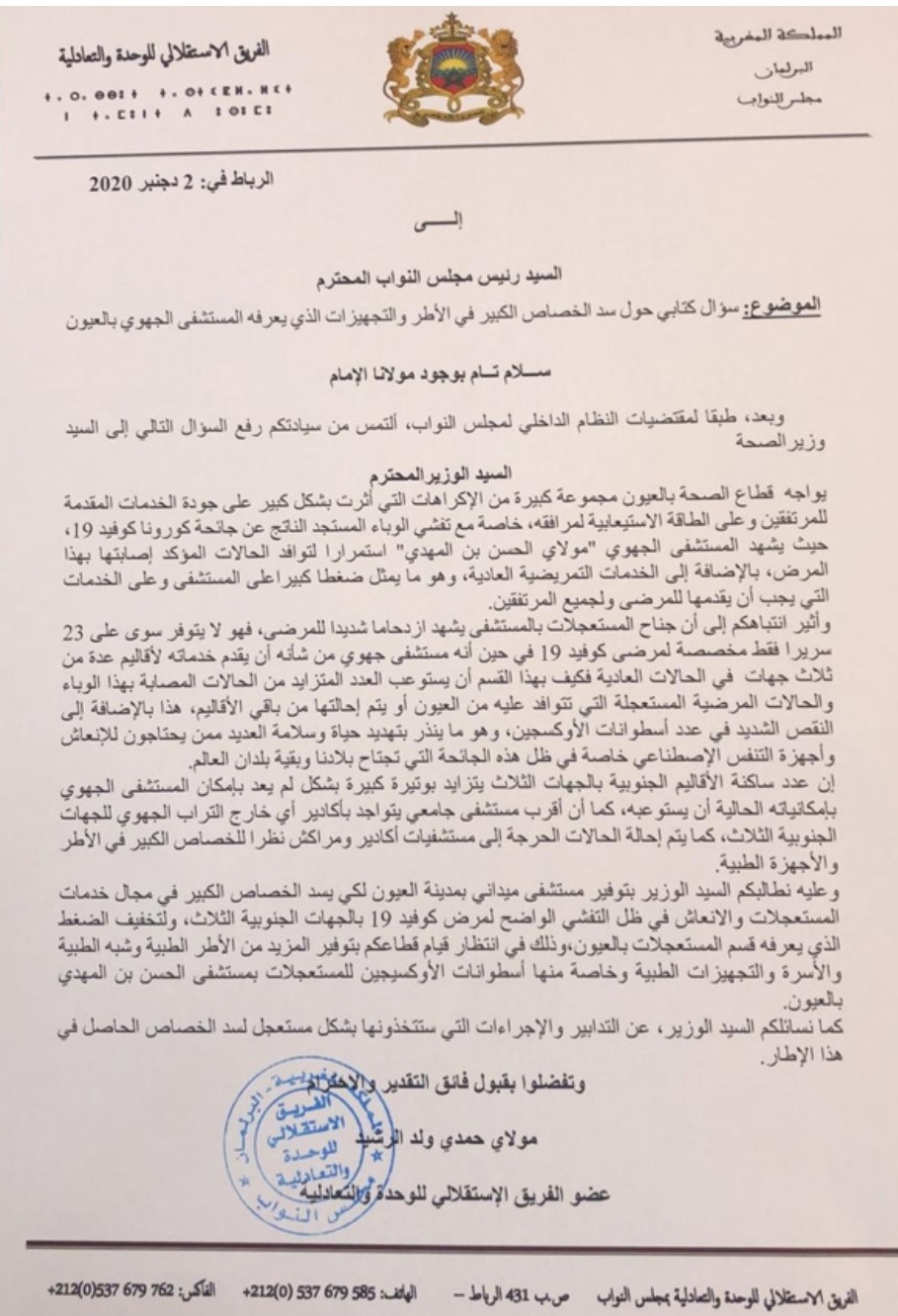 في سؤال كتابي موجه لوزير الصحة..ولد الرشيد يدعو لإنشاء مستشفى ميداني بالعيون